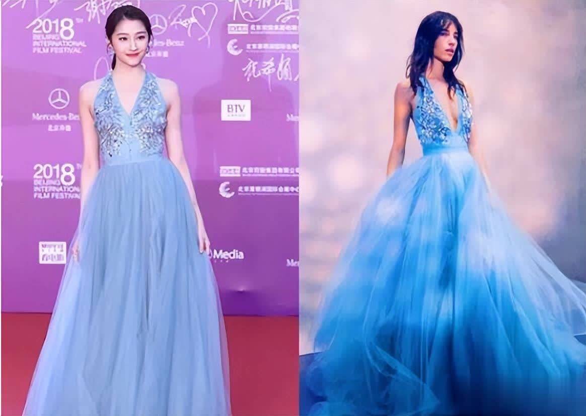 说实话,很多礼服设计都挺性感,除了要身高,还得要个好身材。但是关晓彤,虽然身量很高,但是身材的平整度很一般,所以穿的时候就显得撑不起来,看起来就不够好看。就像这款蓝色礼服就太平整了,完全没有女人味。